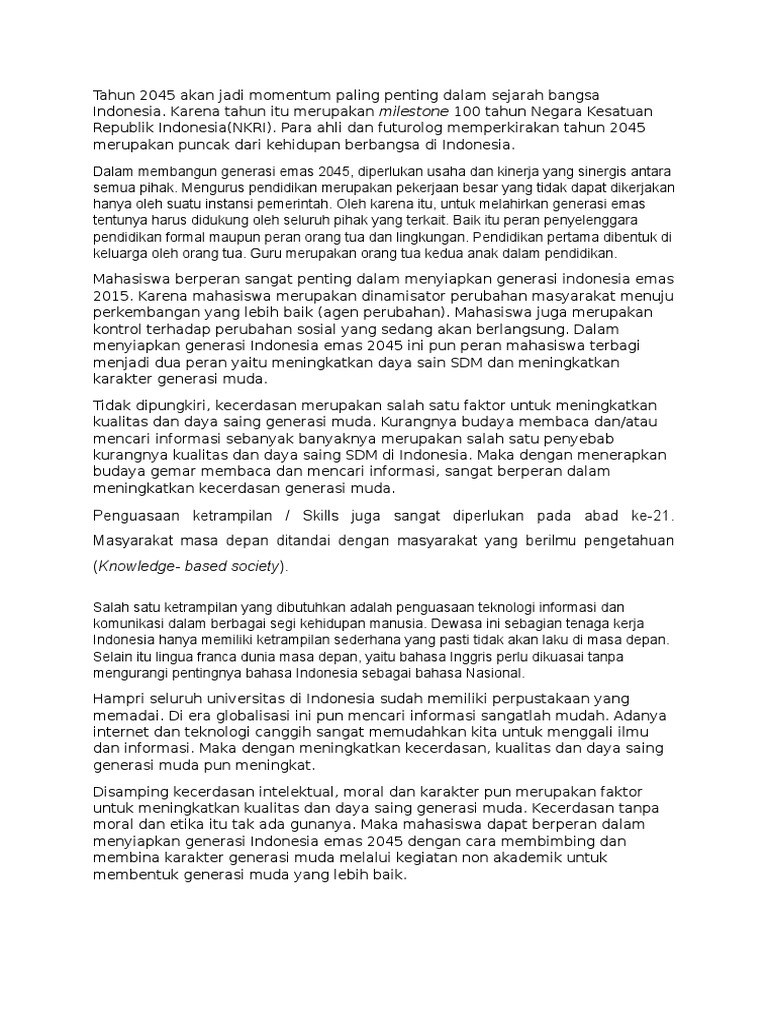 Indonesia emas 2045 pdf. Untuk mewujudkan impian tersebut, kunci utamanya bukan kekuatan ekonomi, politik, atau militer. Salah satu kontribusi bonus tersebut adalah pada sektor pertumbuhan Pendidikan tidak sekadar dimaknai dengan transfer akademik (keilmuan) saja, melainkan dilengkapi dengan karakter.