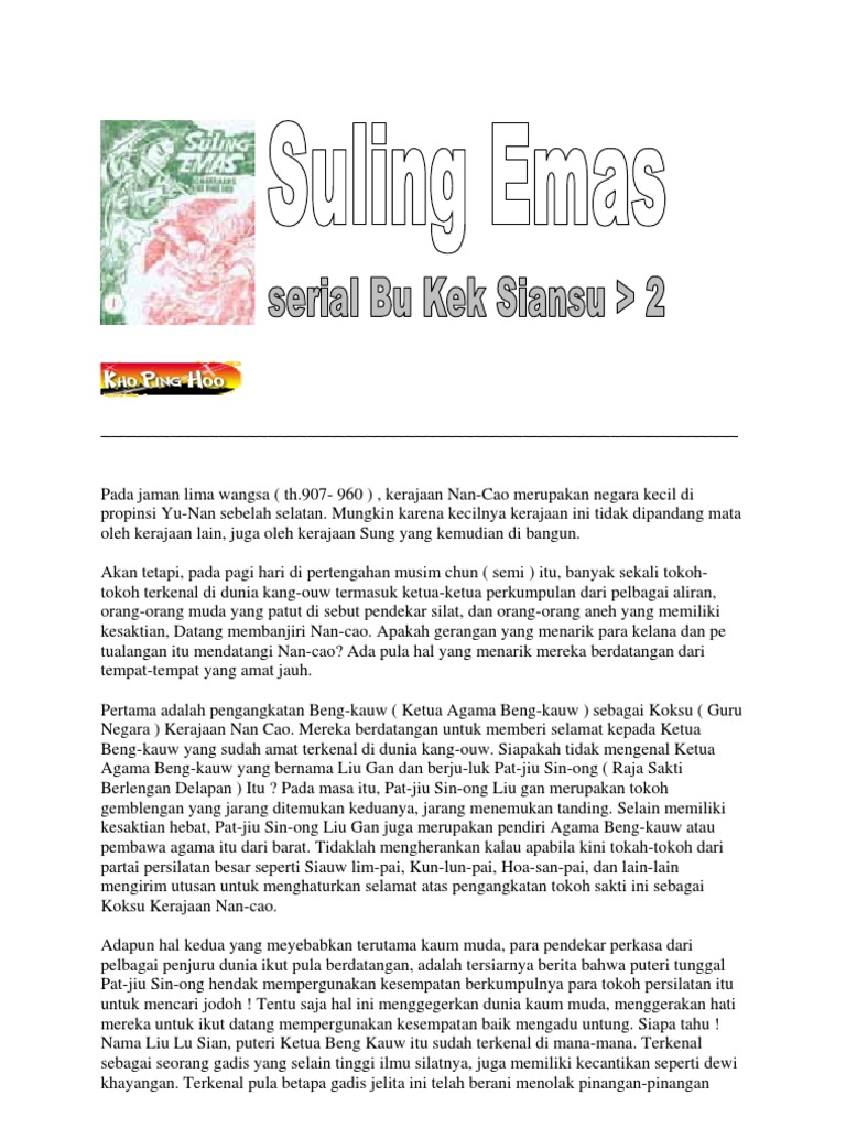 Suling emas adalah episode kedua dari serial bu kek sian su yang ditulis oleh kho ping hoo.cerita ini menyambung langsung kisah sebelumnya yang merupakan pembuka kisah ini. Suling emas dan naga siluman > karya kho ping hoo > published by buyankaba.com 3 nyawaku lebih murah daripada seekor domba! Keluarkan suling emas itu dan kau ajari aku meniup suling! bu song kaget.
